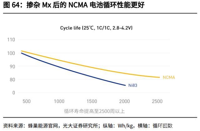 單晶化:目前三元材料多為細(xì)小晶粒(直徑幾百 nm)團(tuán)聚成的二次球形多晶顆 粒(直徑幾 μm 到幾十 μm),多晶三元材料由于顆粒內(nèi)部存在應(yīng)力導(dǎo)致材料循 環(huán)過程中易開裂,而存在循環(huán)壽命短、熱穩(wěn)定性差的缺陷。單晶顆粒(粒徑通常 在 5μm 以下甚至納米級)相對于多晶顆粒,在輥壓時(shí)不會(huì)破碎,有效地提高了 材料的壓實(shí)密度,且單晶顆粒結(jié)構(gòu)穩(wěn)定性好,能在長循環(huán)后保持原狀,提高安全 性能。