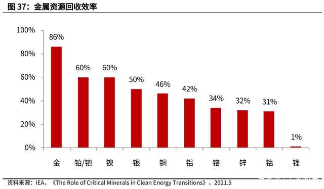 未來,廢舊動(dòng)力鋰電池回收將會(huì)形成一個(gè)十分龐大的市場。目前全球?qū)τ阡嚭拖?土資源供給(電池和電機(jī)的核心礦物資源),還是圍繞一次資源提取供給為主。 根據(jù) IEA 的報(bào)告,當(dāng)下中鎳、鈷的回收率還可以,但鋰幾乎沒有回收能力(回收 率<1%)。我們可以預(yù)見進(jìn)入 TGWh 時(shí)代后,鋰電池大規(guī)模退役,上游礦物資 源缺口會(huì)引發(fā)龐大的回收浪潮。