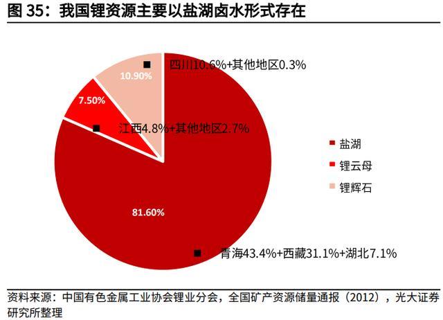 據(jù)中國有色金屬工業(yè)協(xié)會(huì)鋰業(yè)分會(huì)統(tǒng)計(jì),鋰資源儲(chǔ)量約為 714 萬噸(金屬鋰噸), 其中青海地區(qū)的儲(chǔ)量占全國的 43.4%,西藏地區(qū)的儲(chǔ)量占全國的 31.1%,是占 比最高的兩個(gè)地區(qū)。我國鋰資源主要以鹽湖鹵水形式存在,占比高達(dá) 81.6%。 因此在全球鋰電市場大跨步邁向 TWh 時(shí)代之際,加大我國鹽湖鋰資源的開發(fā)力 度勢在必行,鹽湖提鋰也將構(gòu)成未來我國甚至全球新增鋰礦產(chǎn)能的主體。