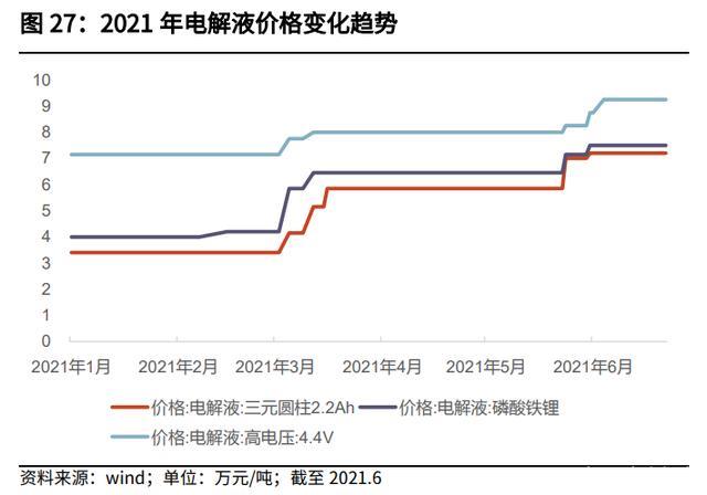 電解液供應(yīng)緊張,尤其受限于上游的 6F、VC 供應(yīng)。2021 年以來,電解液價(jià)格 持續(xù)上漲,上游的 6F 價(jià)格漲幅大于電解液價(jià)格漲幅。根據(jù) wind 數(shù)據(jù),三元圓 柱 2.2Ah/磷酸鐵鋰/4.4V 高電壓電解液價(jià)格 2021 年 1 月出的價(jià)格為 3.4/4/7.15 萬元/噸,到 2021 年 6 月末,價(jià)格已上漲到 7.2/7.5/9.25 萬元/噸,漲幅為 112%/88%/29%;6F 價(jià)格 2021 年 1 月初的價(jià)格為 11.25 萬元/噸,到 2021 年 6 月末,價(jià)格已上漲到 31.5 萬元/噸,漲幅為 180%。