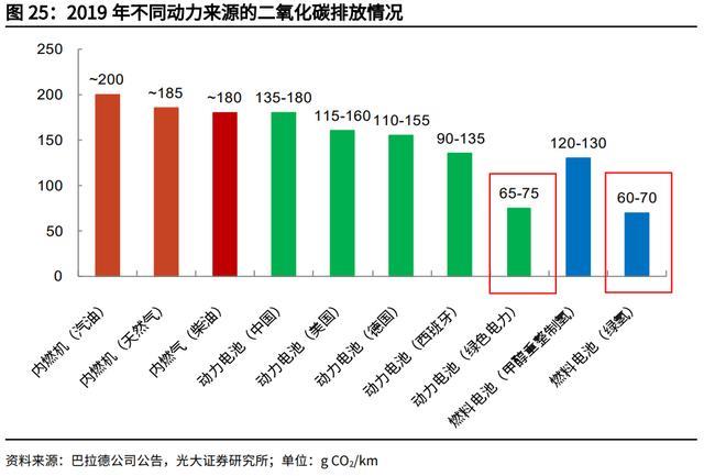 針對于不同車用動(dòng)力源的全生命周期排碳水平,全球氫燃料電池龍頭巴拉德公司 也進(jìn)行了測算,其核心結(jié)論在于:能源供給側(cè)的清潔程度是決定因素,無論是鋰 電池汽車還是氫燃料電池車,如果電力或者氫氣來自于化石能源,那么其排碳水 平依然較高。所以若要能源需求側(cè)的汽車使用端減碳,還是需要推動(dòng)能源供給側(cè) 使用清潔能源。如果能源供給側(cè)均使用清潔能源,那么鋰電池汽車和氫燃料電池 汽車全生命周期排碳水平分別為 65-75 g/km;60-70 g/km。