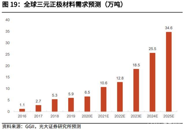 預(yù)計(jì) 2025 年全球三元正極材料需求量 34.6 萬噸,磷酸鐵鋰 34.9 萬噸