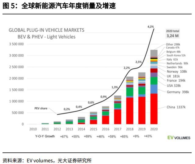 盡管 2020 年的新冠疫情導(dǎo)致全球汽車總銷量下滑了 14%,但全球電動(dòng)汽車的銷 量卻在 2020 年逆勢大漲,達(dá)到 320 萬輛以上。根據(jù) EV volumes 數(shù)據(jù),2020 年全球新能源汽車的的銷量為 324 萬,而 2019 年同期為 226 萬,同比增長了 43.36%。