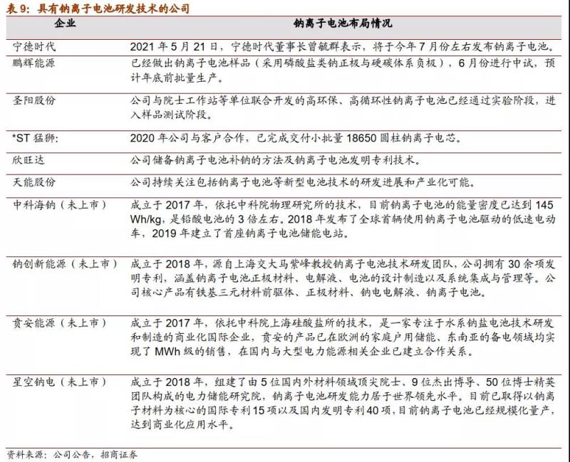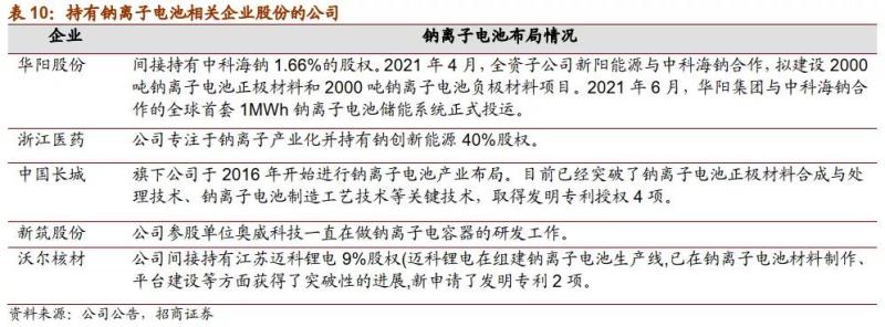中科海鈉依托中科院物理所,鈉離子電池技術領先。中科海鈉成立于2017年,核心技術來源于中國科學院物理研究所清潔能源實驗室,是國內(nèi)首家專注于鈉離子電池研發(fā)與生產(chǎn)的高新技術企業(yè),公司擁有鈉離子電池核心專利15篇,在鈉離子電池全生產(chǎn)鏈各個環(huán)節(jié)已掌握具有完全自主研發(fā)的核心技術,目前已成功開發(fā)出的鈉離子電池能量密度達到145Wh/kg。2021年4月,華陽股份全資子公司新陽能源與中科海鈉合作,擬建設2000噸鈉離子電池正極材料和2000噸鈉離子電池負極材料項目。