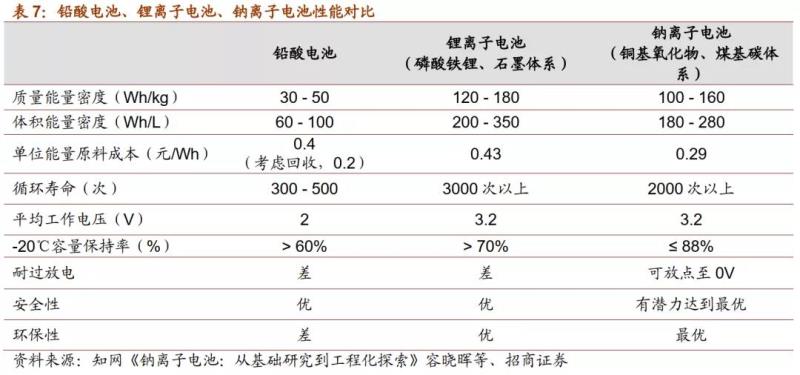 有望逐步替代鉛酸電池,是鋰電池的良好補充。鈉離子電池的能量密度、循環(huán)壽命優(yōu)于鉛酸電池,但低于鋰離子電池。對比鉛酸電池,同等容量的下,鈉離子電池的體積小、重量輕,且能量密度超過鉛酸電池的2倍以上。同時,相比于鋰離子電池,鈉離子電池的內(nèi)阻比鋰離子電池高,發(fā)生短路時發(fā)熱量少溫度較低,且在放電過程中可可放電至0V,因此鈉離子電池較鋰離子電池的安全性能更加優(yōu)異。未來首先可能取代鉛酸電池并逐步實現(xiàn)低速電動車、儲能等領域的無鉛化發(fā)展。