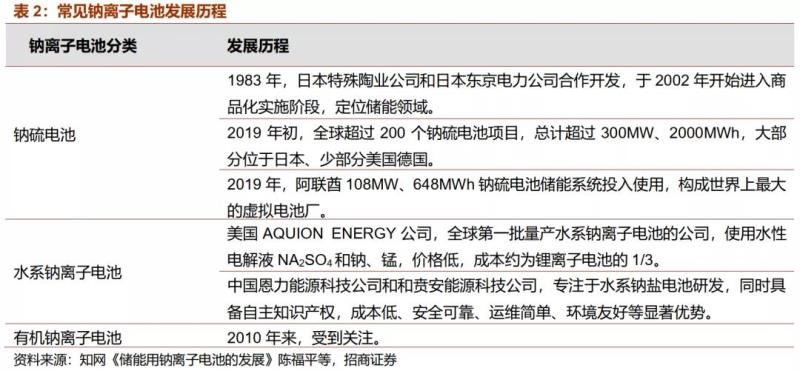鈉離子電池的分類。鈉離子電池可分為鈉硫電池、水系鈉離子電池、有機鈉離子電池、固態(tài)鈉離子電池。鈉硫電池主要以金屬鈉作為負極、非金屬硫作為正極、β-A12O3陶瓷管同時充當電解質(zhì)和隔膜,是目前唯一同時具備大容量和高能量密度的儲能電池。截止2020年,全球從事鈉離子電池工程化的公司超過20家,包括松下、豐田等。2017年,我國首家鈉離子電池公司中科海鈉成立,依托中國科學院物理研究所的技術,目前在技術開發(fā)和產(chǎn)品生產(chǎn)上都初具規(guī)模。