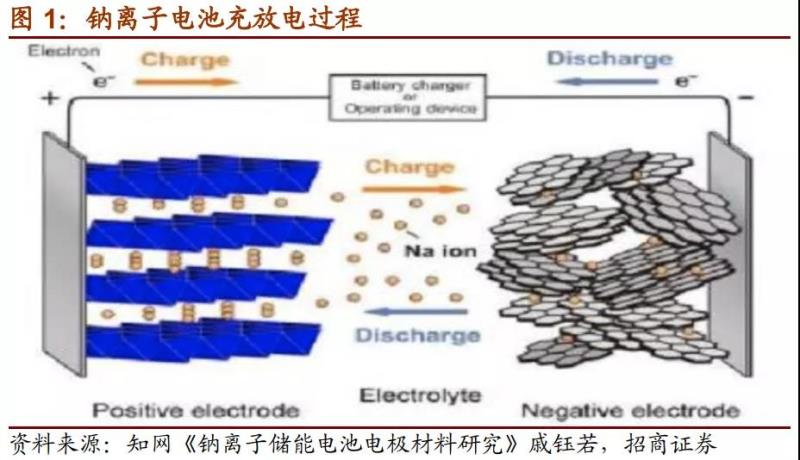 鈉離子工作原理與鋰離子電池類似。鈉離子電池作為充電電池的一種,主要由正、負極、電解質(zhì)、隔膜、集流體等組成。其工作原理是利用鈉離子在正負極之間的可逆脫嵌從而實現(xiàn)充、放電的,與鋰電池類似。