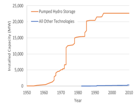 抽水蓄能發(fā)電設(shè)施的建設(shè)和交付周期通常很長(zhǎng),這導(dǎo)致在上世紀(jì)90年代以來很少建設(shè)此類項(xiàng)目。圖1顯示了截至2010年這些抽水蓄能電站的累積部署情況,以及其他儲(chǔ)能技術(shù)部署情況(主要是1992年建成的一個(gè)壓縮空氣儲(chǔ)能設(shè)施)。