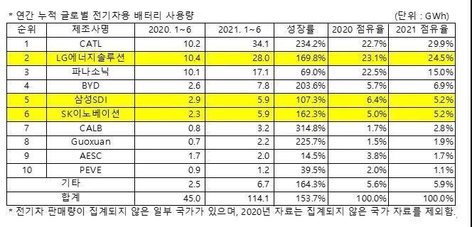 近日,韓國能源市場分析機構SNE Research公布的統(tǒng)計數(shù)據(jù)顯示,今年上半年,全球車載動力電池裝機量共計114.1 GWh,較去年同期的45 GWh增長了1.5倍。其中,排名前三的公司依次是寧德時代(CATL)、LG能源和松下,三家巨頭占據(jù)了全球動力電池市場近70%的份額。
