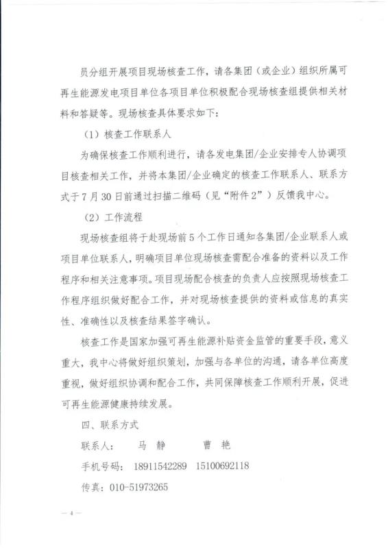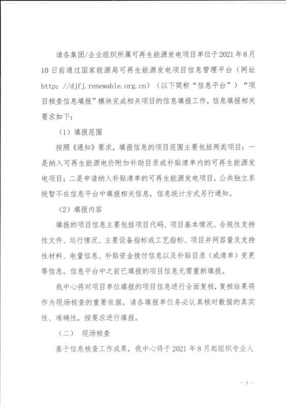 此次核查將采取信息核查與現(xiàn)場核查相結(jié)合的方式,各發(fā)電企業(yè)需要在8月10日前通過國家能源局可再生能源發(fā)電項目信息管理平臺完成相關項目的信息填報工作;基于信息核查工作成果,國家可再生能源信息中心將于2021年8月起組織專業(yè)人員分組開展項目現(xiàn)場核查工作。