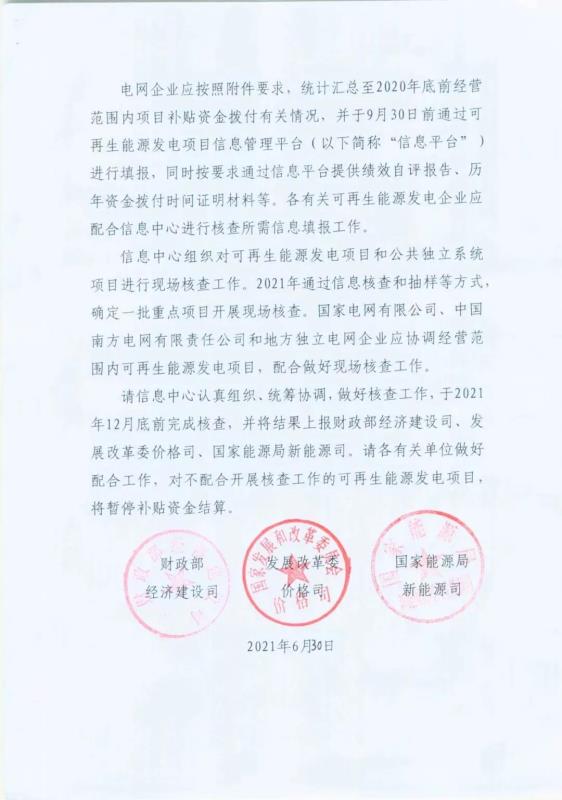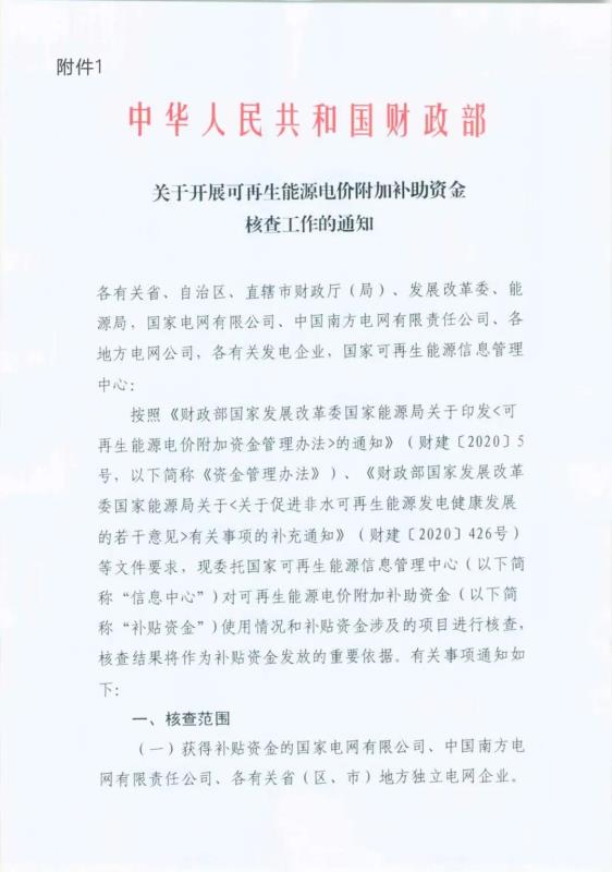 近日,國家可再生能源信息管理中心發(fā)函至各企業(yè)協(xié)助開展2021年度可再生能源電價附加補助資金核查工作。根據(jù)財政部經(jīng)建司、國家發(fā)改委價格司、國家能源局新能源司聯(lián)合下發(fā)的《關于開展可再生能源電價附加補助資金核查工作的通知》,國家可再生能源信息中心將對享受國家可再生能源電價附加補助資金的風電、光伏發(fā)電、生物質(zhì)發(fā)電項目以及公共獨立系統(tǒng)項目進行核查。