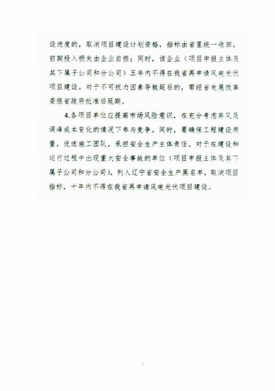 對于因非不可抗力未按時間節(jié)點完成建設(shè)進(jìn)度的,取消項目建設(shè)計劃資格,該企業(yè)五年內(nèi)不得在遼寧境內(nèi)申請風(fēng)電光伏建設(shè);在建設(shè)和運行過程中出現(xiàn)重大安全事故的單位,十年內(nèi)不得在遼寧境內(nèi)申請風(fēng)電光伏建設(shè)。