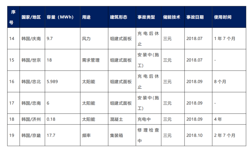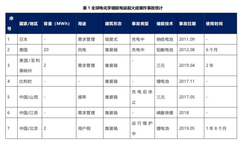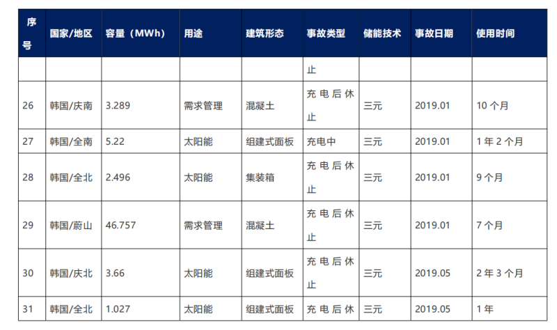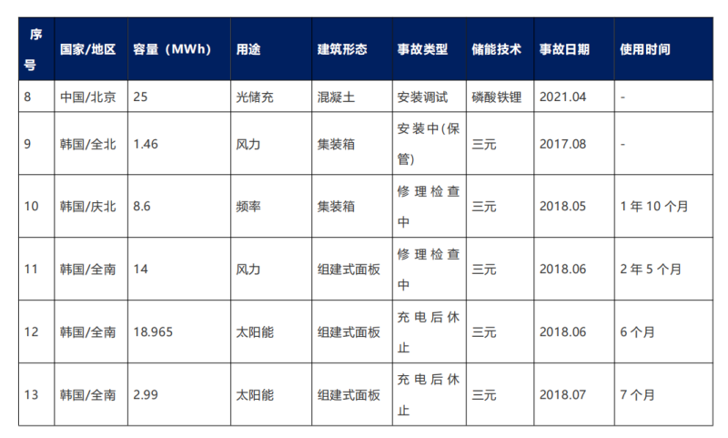 為幫助了解儲能電站發(fā)生火災或爆炸事故的情況,接下來對全球儲能項目主要火災或爆炸事故的公開信息進行整理,匯總了近10年間發(fā)生事故的儲能電站的基本信息,總結了起火爆炸事故的基本特征。依據文獻“韓國鋰離子電池儲能電站安全事故的分析及思考”,給出了儲能電站發(fā)生安全事故的基本原因以及經驗總結;并根據網絡公開信息,搜集了美國發(fā)生人身傷亡事故的儲能電站爆炸事件的原因及整改措施。