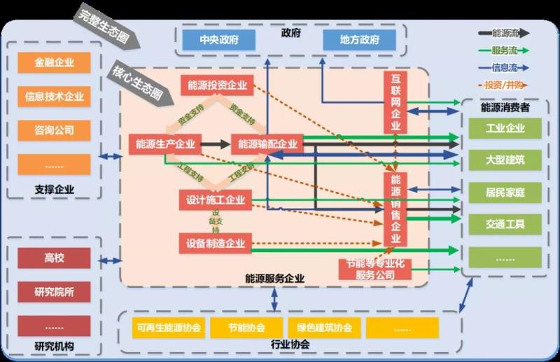 綜合能源服務(wù)的發(fā)展促使產(chǎn)業(yè)分工不斷細(xì)化,產(chǎn)業(yè)生態(tài)加速形成。綜合能源服務(wù)產(chǎn)業(yè)生態(tài)由能源消費(fèi)者、能源服務(wù)企業(yè)、支撐企業(yè)、研究機(jī)構(gòu)、行業(yè)協(xié)會、政府六部分共同構(gòu)成,呈現(xiàn)出主體眾多、鏈條復(fù)雜的特點(diǎn)。