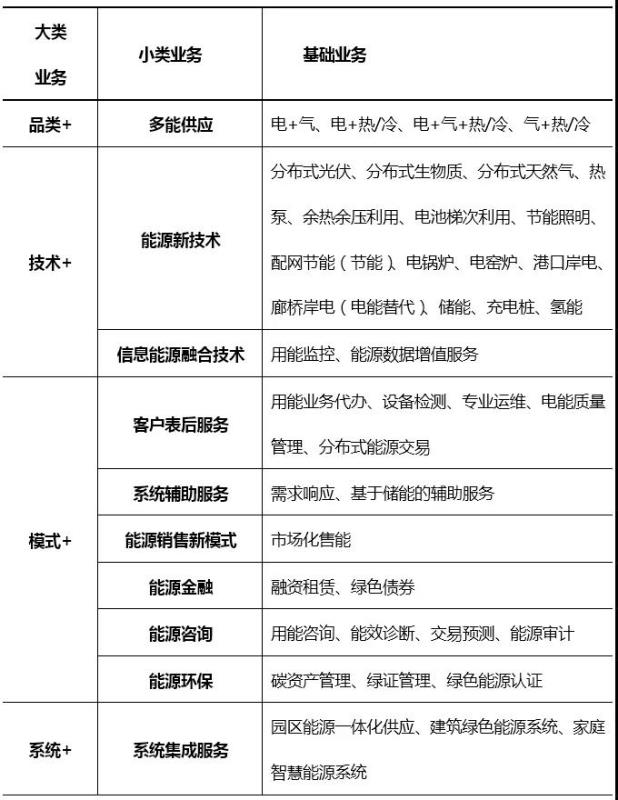 綜合能源服務(wù)業(yè)務(wù)類型十分豐富,從業(yè)務(wù)的“核心特征”來看,可分為“品類+、技術(shù)+、模式+、系統(tǒng)+”四大類,既有簡單組合式的“綜合”,又有融合創(chuàng)新式的“綜合”。梳理當(dāng)前綜合能源服務(wù)商的典型業(yè)務(wù),形成綜合能源服務(wù)全業(yè)務(wù)表(見表1)。