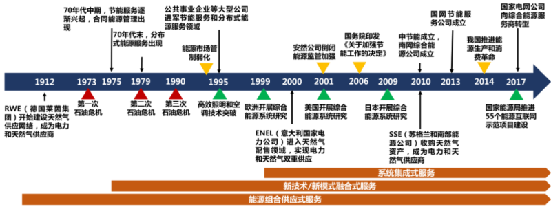 最早出現(xiàn)的綜合能源服務(wù)形式是能源品種組合。根據(jù)公開資料,電力和燃?xì)饨M合供應(yīng)服務(wù)至少在1912年就已在德國出現(xiàn)。