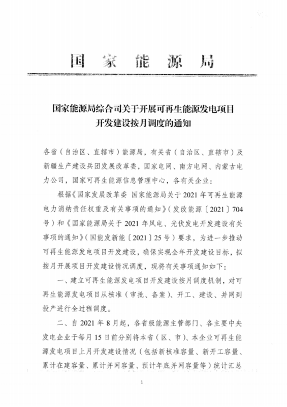 7月29日,國家能源局綜合司下發(fā)了《關于開展可再生能源發(fā)電項目開發(fā)建設按月調度的通知》,擬按月開展項目開發(fā)建設情況調度,從核準、開工、建設、并網到投產進行全過程調度。上報項目包含光伏、風電、水電、生物質發(fā)電、整縣推進分布式光伏以及源網荷儲項目。