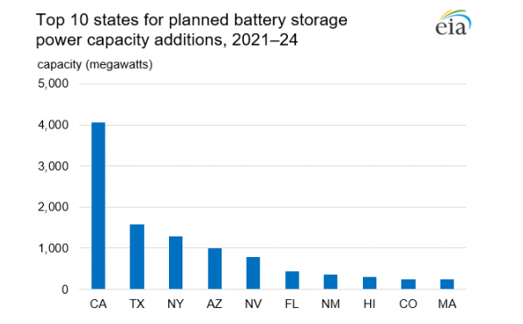 預(yù)計從現(xiàn)在到2024年底,總裝機容量為10.9GW電池儲能系統(tǒng)將分別部署在美國22個州,而加利福尼亞州、德克薩斯州、亞利桑那州和紐約州將部署其中的70%。加州仍將在美國儲能市場再次領(lǐng)先,計劃部署的電池儲能系統(tǒng)的裝機容量超過4GW。