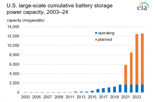 這些統(tǒng)計數(shù)據(jù)來自美國能源信息署(EIA)最新版電力月度報告的調(diào)查結(jié)果,美國政府利用這個機會描繪了美國能源行業(yè)處于快速上升軌道的愿景。美國的第一個電池儲能系統(tǒng)于2003年部署,從那時起直到2012年累計部署的電池儲能系統(tǒng)裝機容量才達到100MW。