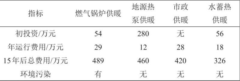 在20世紀80年代初,歐洲已成功開發(fā)和運行水儲熱技術的電力供暖系統(tǒng),以解決冬季供暖高峰負荷問題,美國也采用上述相關技術,并取得了很大成效[9]。Verda等[10]以都靈地區(qū)供暖系統(tǒng)為例證明,水儲熱系統(tǒng)可減少約12%的一次能源消耗和約5%的總成本。邵小珍等[11]設計并建造了護國寺中醫(yī)院水儲熱供暖系統(tǒng),經(jīng)過實際運行發(fā)現(xiàn),鍋爐出水溫度可達到70 ℃,保證用戶在室外溫度較低時的采暖,鍋爐房各項指標基本達到設計要求。麻延等[12]采用水儲熱技術為北京市建筑質量監(jiān)督總站進行供暖,運行結果表明,水儲熱技術供暖系統(tǒng)運行費用可較燃氣鍋爐省52%,且供暖效果佳,運行時間靈活。王昆[13]對比唐山地區(qū)1萬平米建筑采用120天供暖時間的燃氣、地源熱泵、市政、水蓄熱等供暖技術經(jīng)濟效益,發(fā)現(xiàn)水蓄熱供暖技術綜合經(jīng)濟效益最佳,見表5。張旭等[14]分析了賓館水蓄熱供暖技術技術可行性,發(fā)現(xiàn)水蓄熱技術的投資回收期為1.3年,運行成本低于燃油鍋爐和燃氣鍋爐。