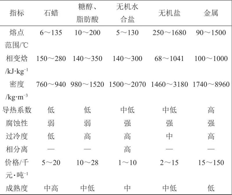 按照工作溫度,固-液相變材料又分低溫相變材料和高溫相變材料。其中,低溫相變材料主要包括聚乙二醇、石蠟和脂肪酸等有機物及無機水合鹽,中高溫相變材料主要包括無機鹽、金屬和合金等。不同的相變材料特點見表2[7,8]。從表中可以看出,石蠟、無機水合物等低溫相變材料技術成熟度相對較高,已實現(xiàn)部分材料的示范應用,但是仍存在導熱系數(shù)低、腐蝕性、過冷度和相分離等問題;無機鹽、金屬等中高溫相變材料雖然具有相變焓較大、密度較高等優(yōu)點,但是相關材料腐蝕性、過冷度等問題仍需要進一步研究,目前技術成熟度較低,仍處于實驗室研究階段。