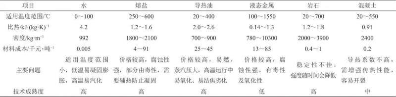 根據(jù)儲熱材料的相態(tài),常用的顯熱儲熱技術可以分為液體儲熱材料和固體儲熱材料。常見的液體儲熱材料包括水、熔鹽、導熱油、液態(tài)金屬等,固體儲熱材料包括巖石、復合混凝土等。不同顯熱儲熱材料特點見表1[4,5,6]。其中,水、導熱油、巖石、混凝土等是最常見的低溫(<120 ℃)顯熱儲熱材料,導熱油、熔鹽、巖石、混凝土等也是常見的中高溫(120~600 ℃)顯熱儲熱材料,巖石和液態(tài)金屬也是超高溫(≥600 ℃)顯熱儲熱材料,但是液態(tài)金屬技術尚不成熟,處于研究階段。
