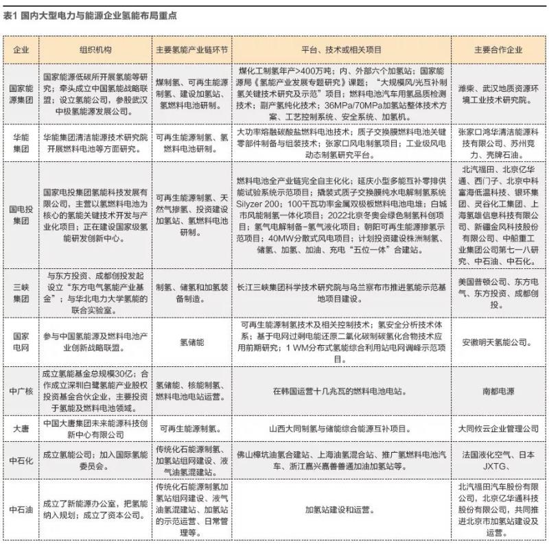 當(dāng)前我國氫能發(fā)展處于初期,各大央企從氫能基礎(chǔ)設(shè)施建設(shè)、關(guān)鍵技術(shù)研發(fā)、產(chǎn)品推廣應(yīng)用等場景積極布局。據(jù)香橙會研究院統(tǒng)計,2019年國務(wù)院國資委監(jiān)管的96家央企中,開展氫能相關(guān)業(yè)務(wù)或布局的中央企業(yè)有26家,數(shù)量占比高達27%,涉及的氫能產(chǎn)業(yè)鏈側(cè)重于制氫、氫燃料電池研發(fā)以及加氫站建設(shè)。從氫能產(chǎn)業(yè)相關(guān)布局來看,各大企業(yè)分別從組織機構(gòu)、核心關(guān)鍵零部件技術(shù)、示范工程項目等方面開展相關(guān)工作,詳情見表1。