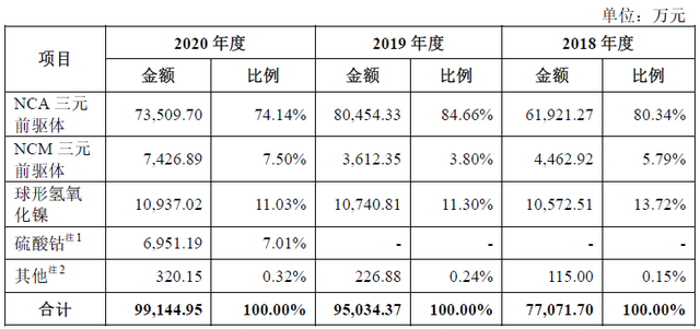截止2020年末,NCA三元前軀體業(yè)務營收占比74.14%,為公司主要收入來源。另一三元前驅體路線NCM業(yè)務營收占比7.5%,尚處于發(fā)展初期,營收占比較小。球形氫氧化鎳業(yè)務近三年營收占比維持在11%左右。
