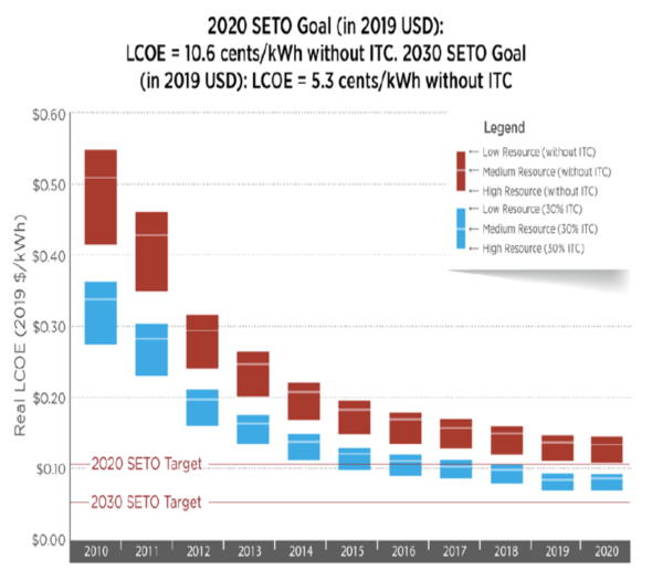 從2010年到2020年,住宅太陽能發(fā)電系統(tǒng)電力成本基準降低了74%(從2019年到2020年降低了1%),使無補貼的平準化能源成本(LCOE)在0.11美元/kWh至0.16美元/kWh降到了0.07美元/kWh至0.09美元之間。為了實現(xiàn)SETO 2020年住宅太陽能發(fā)電系統(tǒng)的平準化能源成本(LCOE)目標,即10.6美分/kWh。還使用穩(wěn)態(tài)融資假設(shè)計算沒有聯(lián)邦稅收抵免(ITC)的太陽能發(fā)電系統(tǒng)平準化能源成本(LCOE)。在這些假設(shè)下,2020年第一季度無補貼住宅太陽能發(fā)電系統(tǒng)(LCOE)的范圍從0.10美元/kWh到0.14美元/kWh。
