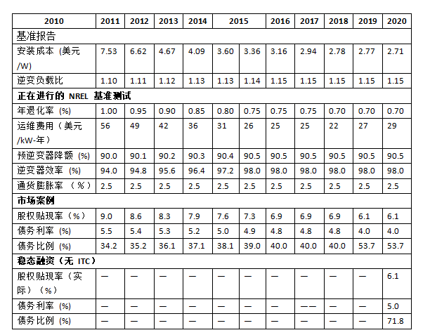 2010~2018年的所有數(shù)據(jù)均來自Fu、Feldman和Margolis(2018年)報告,并根據(jù)通貨膨脹進行了調(diào)整。住宅太陽能發(fā)電系統(tǒng)即平準化能源成本(LCOE)假設(shè):(1)系統(tǒng)壽命為30年;(2)聯(lián)邦稅率21%;(3)州稅率6%;(4)修正加速成本回收系統(tǒng)(MACRS)折舊計劃;(5)沒有聯(lián)邦或地方補貼;(6)運營資金及償債準備金占到運營成本及償還債務(wù)的6個月(利率為1.75%);(7)三個月期建設(shè)貸款,利率為4%,手續(xù)費為系統(tǒng)成本的1%;(8)發(fā)電模塊傾角為25度,方位角180度;(九)18年期限的債務(wù);(10)1億美元住宅項目池的TPO交易的110萬美元前期金融交易成本;(11)來自Feldman、Bolinger和Schwabe(2020年)的2019年和2020年財務(wù)假設(shè)。