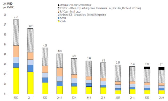 從2019年到2020年,住宅太陽能發(fā)電系統(tǒng)成本基準下降了2%。