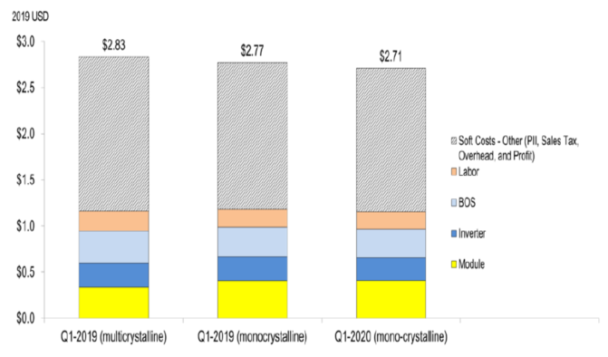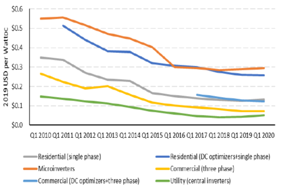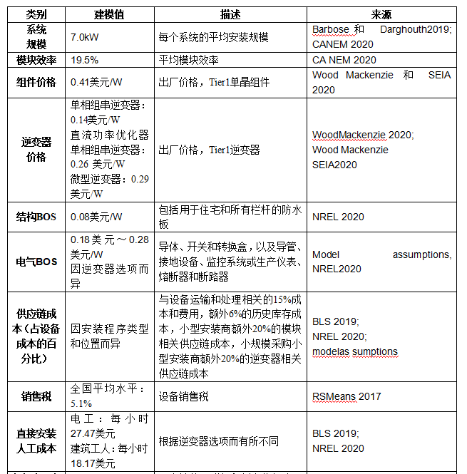 對于住宅太陽能系統(tǒng)成本計算,分別對組串級逆變器、功率優(yōu)化器和微型逆變器選項進行建模,并在加權(quán)平均情況下在2020年第一季度模型中使用它們的市場份額(14.6%、49.8%和35.6%)。