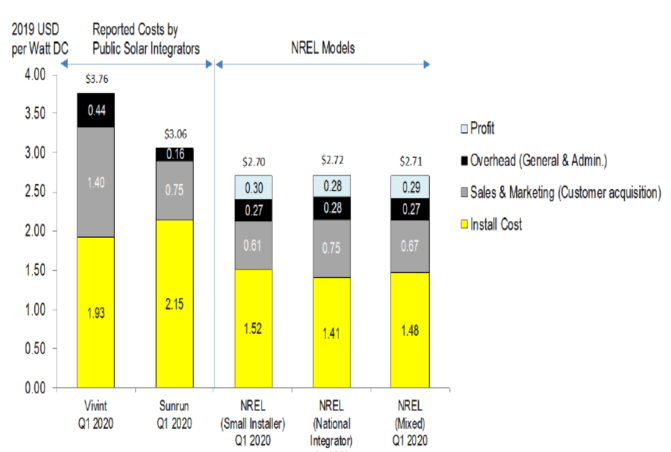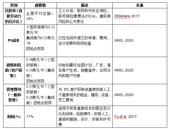 自下而上的建模方法產(chǎn)生的成本結(jié)構(gòu)不同于太陽能發(fā)電集成商在其公司文件中提到的成本結(jié)構(gòu)。由于集成商銷售和租賃太陽能發(fā)電系統(tǒng),他們采用與只是銷售商品的銷售商不同的報告成本方法。租賃太陽能發(fā)電系統(tǒng)的許多成本是在租賃期限內(nèi)產(chǎn)生的,而不是在銷售期間產(chǎn)生的,因此很難確定銷售的實際成本。盡管太陽能發(fā)電開發(fā)商Sunrun公司和Vivint Solar公司的文件按照季度來報告系統(tǒng)成本,但由于其公開文件缺乏透明度,因此很難確定這些成本的準確性。安裝成本的部分差異可能會出現(xiàn)來自太陽能發(fā)電集成商在2020年第一季度安裝的系統(tǒng)中使用的先前合同。