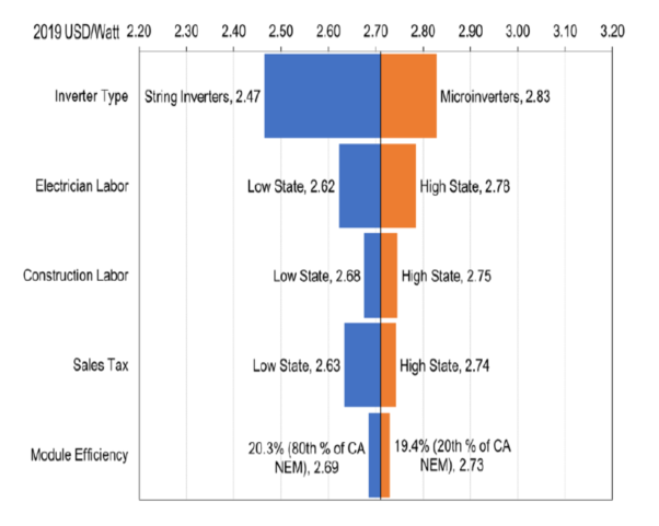 該圖顯示了混合部署情況下基準的敏感性分析,成本類別因位置和硬件規(guī)格而異。逆變器類型對安裝太陽能發(fā)電系統(tǒng)成本的影響最大,使用組串式逆變器的成本為2.47美元/W,使用微型逆變器的成本為2.83美元/W。