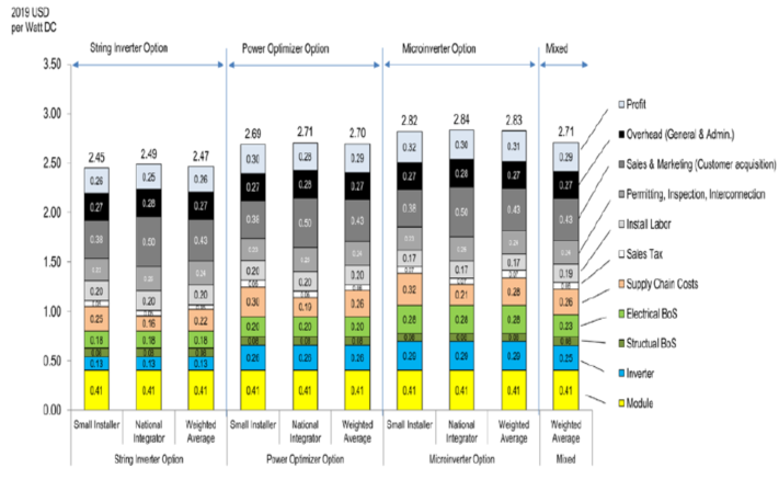 該圖顯示了美國住宅太陽能發(fā)電系統(tǒng)模型中的基準成本。太陽能發(fā)電系統(tǒng)安裝商62%的市場份額和集成商38%的市場份額用于計算加權(quán)平均值。組串逆變器、功率優(yōu)化器和微型逆變器選項都需要單獨建模,混合部署的將應(yīng)用它們的市場份額(14.6%、49.8%和35.6%)作為權(quán)重。