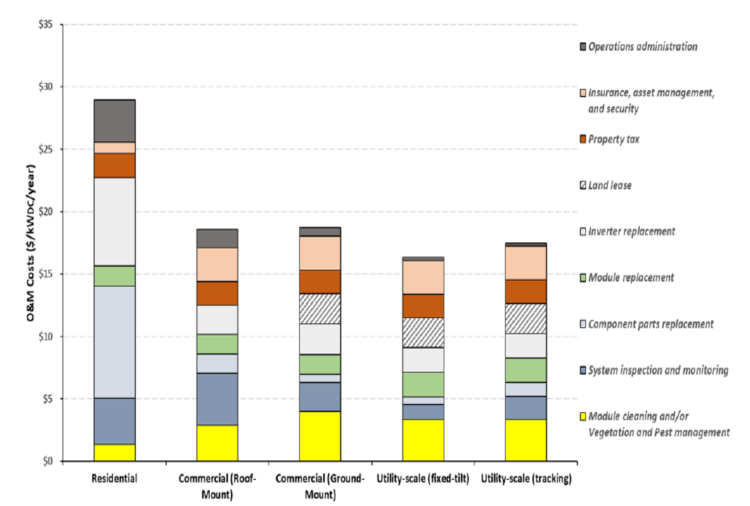 在2018年,美國能源部下屬的太陽能發(fā)電系統(tǒng)運營和維護(O&M)工作組開發(fā)了一個模型用來計算與太陽能發(fā)電系統(tǒng)運維相關(guān)的成本。成本模型中的133項措施分為9個運維成本類別:逆變器更換、運營管理、模塊更換、零部件更換、系統(tǒng)檢查和監(jiān)控、模塊清潔和/或植被和蟲害管理、土地租賃、財產(chǎn)稅、以及保險、資產(chǎn)管理和安全。目前的成本基準是28.94美元/kW/年(住宅太陽能發(fā)電系統(tǒng))、18.55美元/kW/年(商業(yè)和住宅太陽能發(fā)電系統(tǒng))、18.71美元/kW/年(商業(yè)和地面安裝的太陽能發(fā)電系統(tǒng))、16.32美元/kW/年(公用事業(yè)規(guī)模太陽能系統(tǒng))和17.46美元/kW/年(公用事業(yè)規(guī)模太陽能系統(tǒng),單軸跟蹤器)