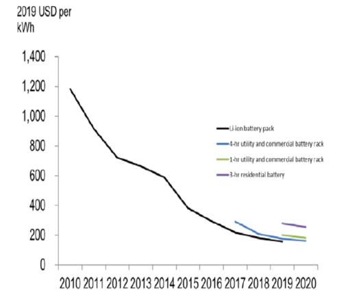 美國鋰離子電池現(xiàn)貨價格在2010年至2019年間大幅下跌(87%)。僅2018年至2019年,價格就下跌了13%。彭博新能源財經(jīng)公司(BNEF)的調(diào)查報告提到的鋰離子電池價格是指用于電動汽車和固定儲能系統(tǒng)的鋰離子電池的加權(quán)平均值。而在前幾年,由于缺乏不同持續(xù)放電時間的電池儲能系統(tǒng)的數(shù)據(jù)使用了加權(quán)平均值(即“鋰離子電池”價格)。在2020年第一季度基準報告中,采用了彭博新能源財經(jīng)公司(BNEF)報告中的固定儲能系統(tǒng)的成本數(shù)據(jù),并按細分市場和持續(xù)放電時間進行區(qū)分。盡管這一基準報告中未提及,彭博新能源財經(jīng)公司(BNEF)的調(diào)查報告還提供了持續(xù)放電時間為30分鐘和2小時的商業(yè)和公用事業(yè)規(guī)模的儲能系統(tǒng)的電池成本數(shù)據(jù)。