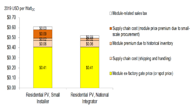 盡管商業(yè)和公用事業(yè)規(guī)模的太陽能發(fā)電系統(tǒng)開發(fā)商通常能夠以現(xiàn)貨價格或接近現(xiàn)貨價格采購太陽能發(fā)電組件,但住宅太陽能集成商和安裝商會產(chǎn)生額外的供應(yīng)鏈成本。當以前采購的模塊安裝在現(xiàn)在的系統(tǒng)中時,其歷史庫存價格可能會導(dǎo)致住宅市場太陽能發(fā)電模塊價格的價格有所滯后(大約6個月)。