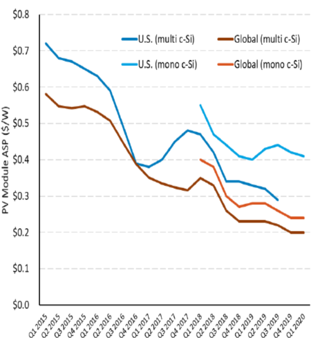 假設(shè)2020年第一季度Tier1單晶硅太陽能發(fā)電組件的出廠價(現(xiàn)貨或首次購買者)為0.41美元/W。雖然全球太陽能發(fā)電組件現(xiàn)貨價格正在持續(xù)下跌,但美國現(xiàn)貨價格卻在2017年上漲。包括美國對進口太陽能發(fā)電模塊的限制政策在內(nèi)的一些因素可能導(dǎo)致了美國和全球現(xiàn)貨價格之間的差異。美國現(xiàn)貨價格在2018年初再次開始下跌,并且在2020年第一季度繼續(xù)下跌,接近歷史最低水平,但單晶硅太陽能發(fā)電組件的交易價格仍高于全球組件平均銷售價格。