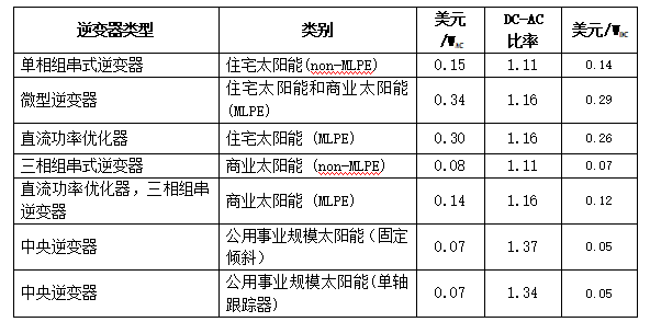 報告使用不同的DC-AC比率(上表)將美元/WAC價格從之前的逆變器價格數(shù)字轉(zhuǎn)換為美元/WDC。而在基準測試中,使用美元/WDC計算所有成本,其中包括逆變器價格。該報告使用勞倫斯伯克利國家實驗室的數(shù)據(jù)更新了逆變器DC-AC比率。
