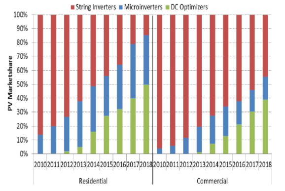 自從2010年以來,組件級電力電子技術(shù)及產(chǎn)品(MLPE)在加州住宅領(lǐng)域的市場占有率一直在快速增長。這種市場增長可能是由于MLPE成本降低以及自2014年以來美國電氣規(guī)范(NEC)第690.12條的建筑物太陽能輸出的“快速關(guān)閉”要求——MLPE本質(zhì)上滿足快速關(guān)閉要求而無需安裝額外的電氣設(shè)備。
