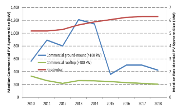 商業(yè)太陽能發(fā)電系統(tǒng)的規(guī)模變化更大,這可能反映了其用戶更加廣泛(例如寫字樓、商場和零售店)。該報告分別使用200kW和500kW作為商業(yè)住宅和地面安裝太陽能發(fā)電系統(tǒng)的基準案例。