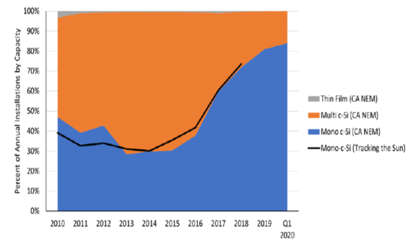 在2020年第一季度基準報告中,使用單晶硅太陽能發(fā)電組件而不是之前的多晶硅太陽能發(fā)電組件對系統(tǒng)進行建模,因為自從2016年以來美國市場轉(zhuǎn)向使用更多的單晶硅太陽能發(fā)電組件。
