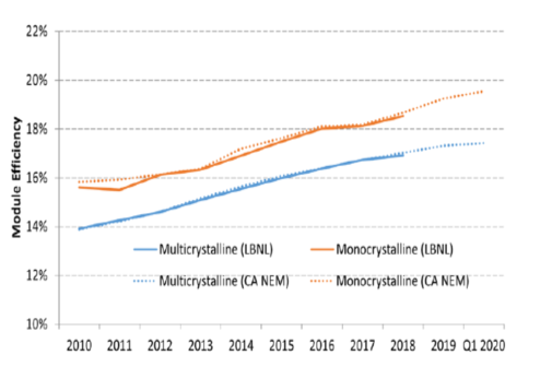 自從2010年以來,單晶硅和多晶硅的太陽能發(fā)電模塊組件效率逐漸提升,60片和72片多晶硅組件的效率每年平均增長0.3%~0.4%。2020年第一季度調(diào)查表明,單晶組件效率已經(jīng)達到19.5%。由于組件選擇可能因地區(qū)和行業(yè)而異,因此其效率和價格可能有所不同。