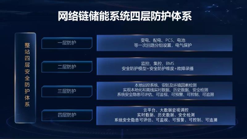 為了確保安全,領(lǐng)充公司還創(chuàng)新性的提出了四層安全防護體系: 網(wǎng)絡(luò)鏈儲能系統(tǒng)采用四層安全防護體系,通過對硬件層、控制層、站控層、平臺層的長期積累與分析,全方位保證儲能系統(tǒng)的安全,實現(xiàn)高級別安全防護。