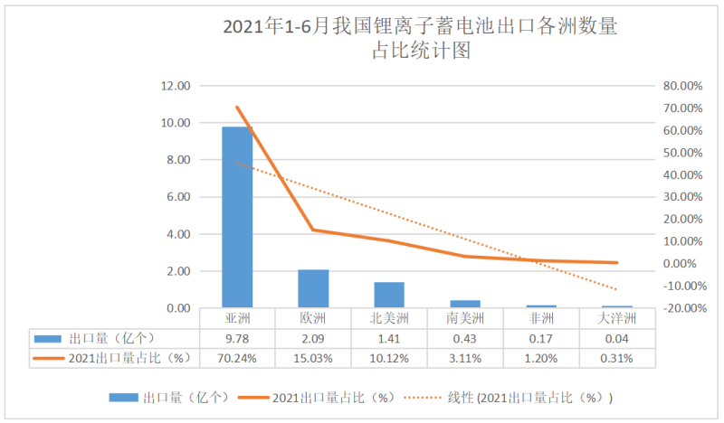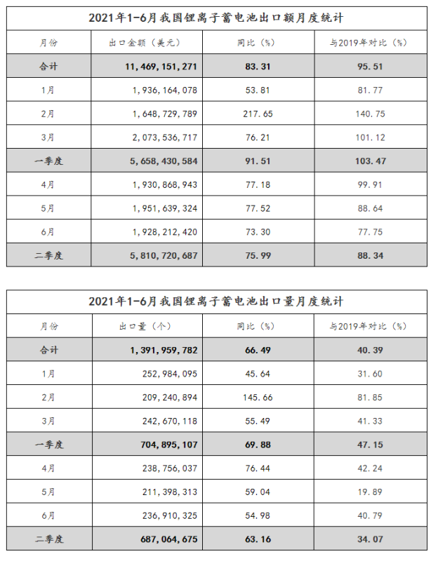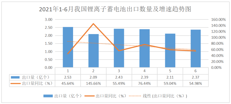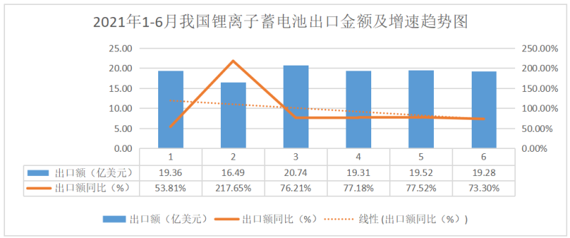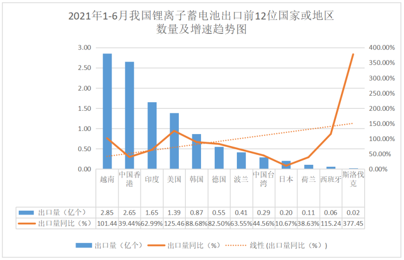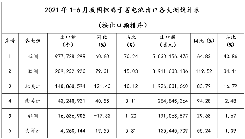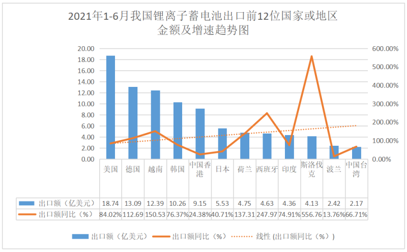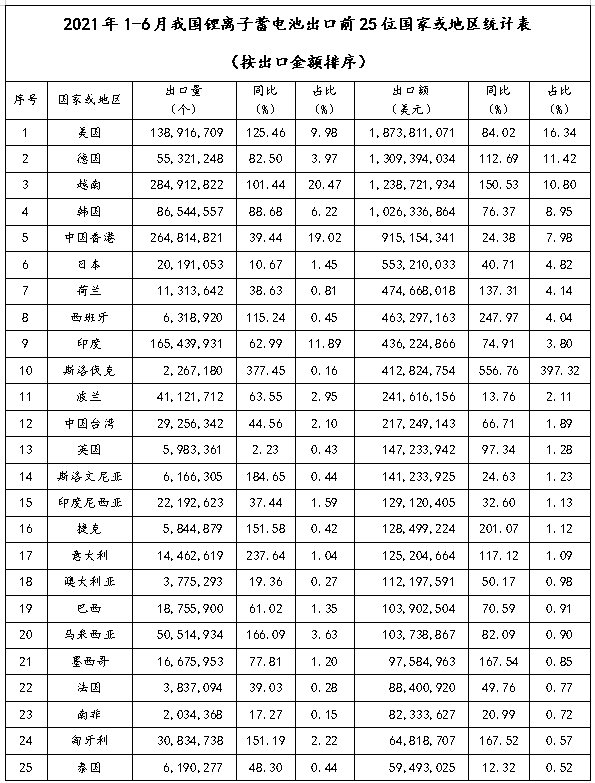 根據(jù)海關(guān)出口數(shù)據(jù)統(tǒng)計(jì)分析,2021年1-6月中國(guó)鋰離子電池出口額達(dá)到114.69億美元,同比增長(zhǎng)83.31%;出口數(shù)量達(dá)到13.92億個(gè),同比增長(zhǎng)66.49%。前十大出口目的地為美國(guó)、德國(guó)、越南、韓國(guó)、中國(guó)香港、日本、荷蘭、西班牙、印度、斯洛伐克,出口額合計(jì)為87.03億美元,占2021年1-6月出口總額的75.88%;出口數(shù)量合計(jì)為10.36億個(gè),占2021年1-6月出口總量的74.42%。