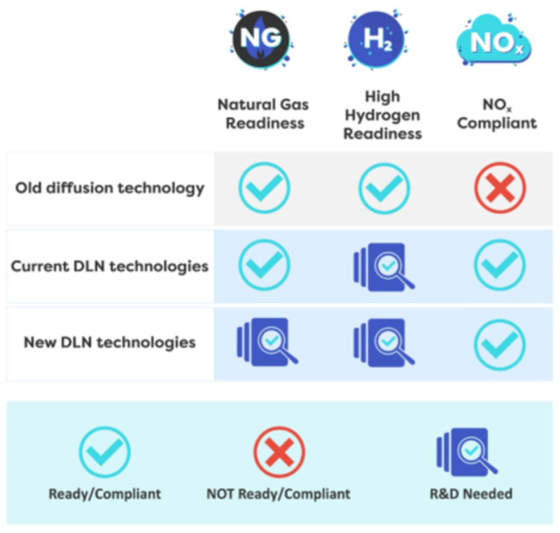 總之,氫無(wú)疑是一種可接受的、非常清潔的燃料。目前存在H2水平50%,與天然氣共同使用的低NOx燃?xì)廨啓C(jī);也已經(jīng)開發(fā)出了用純氫操作的系統(tǒng)。未來(lái)的關(guān)鍵發(fā)展挑戰(zhàn)是低NOx、燃料柔性系統(tǒng),該系統(tǒng)可以在純天然氣到從純氫氣之間等多種燃料成分下輕松操作。下圖概述了這些不同技術(shù)使用氫氣的成熟度、研發(fā)需求和NOx合規(guī)性。