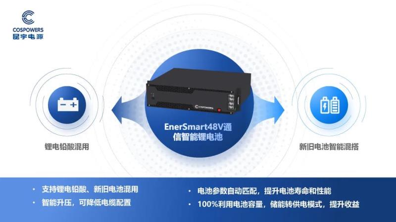 通訊鋰電的核心場景是基站備用電源?;凇叭嵝?、智能、高效”設(shè)計理念,昆宇電源自主研發(fā)生產(chǎn)了智能數(shù)字能源產(chǎn)品 “EnerSmart48V通信智能鋰電池”系列(以下簡稱智慧鋰電),助力5G電池設(shè)備的智能化。