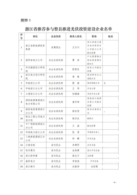 近日,在浙江省某縣流露出的一份整縣推進光伏開發(fā)試點工作方案的征求意見稿中,浙江省推薦了18家央、國、民企參與整縣推進光伏投資建設(shè)。