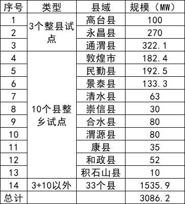 “3+10+X”主要指高臺縣、永昌縣、通渭縣3個試點縣,涉及36個鄉(xiāng)(鎮(zhèn)),規(guī)劃總裝機為692.1MW;“10”即確定10個縣整鄉(xiāng)推進試點,涉及83個鄉(xiāng)(鎮(zhèn)),規(guī)劃裝機858.1MW;“X”為“3+10”外的其他市、縣,共33個縣(區(qū))、涉及797個村,總規(guī)模為1.5359GW。